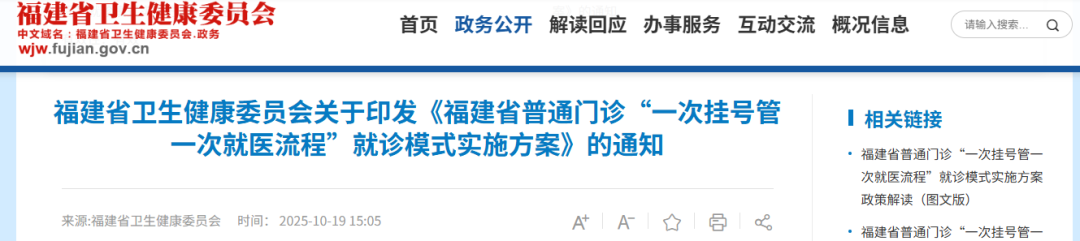 | 近日 福建省卫生健康委员会印发 《福建省普通门诊 “一次挂号管一次就医流程” 就诊模式实施方案》