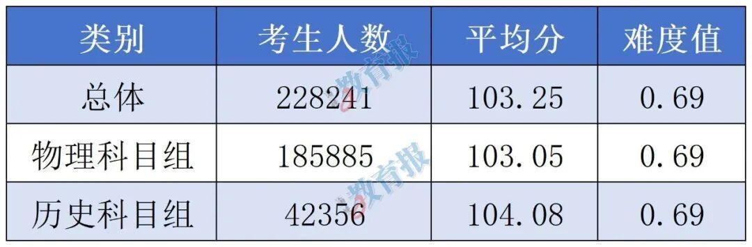 语文学科,全省平均分103.25,其中物理组平均分103.05;历史组平均分104.08。试卷试题难度值为0.69,属于中等偏易。
