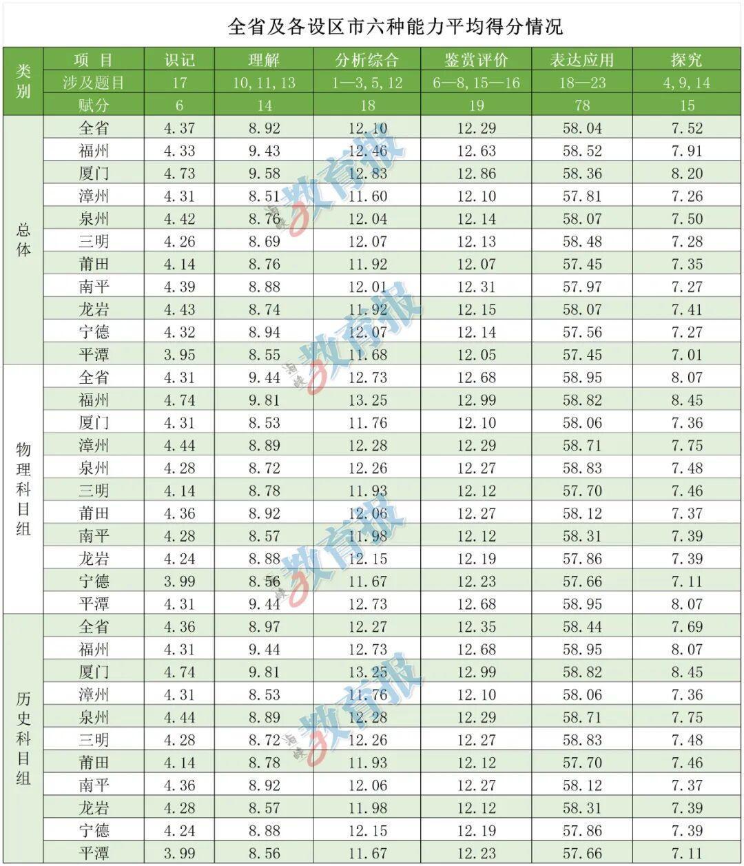 再来看看全省及各设区市六种能力得分情况。据了解,统计数据里所说的六种能力是语文学科在课标和考试说明里反复强调的,分别是识记、理解、分析综合、鉴赏评价、表达应用和探究。