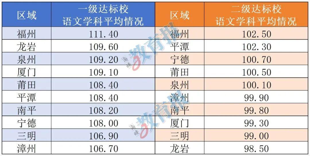 记者将各类学校平均分按各设区市高低进行重新排序。在一级达标校中,福州居第一,平均分为111.40;其次是龙岩,平均分为109.60;泉州、厦门排在第三、第四,平均分分别为109.20和109.10;漳州最低,平均分为106.70。