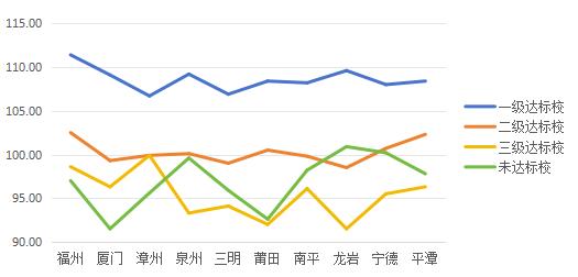 在二级达标校中,福州依旧居第一,平均分为102.50;其次是平潭,平均分为102.30;宁德居第三,平均分为100.70;厦门、三明、龙岩平均分分别为99.30、99.00、98.50。