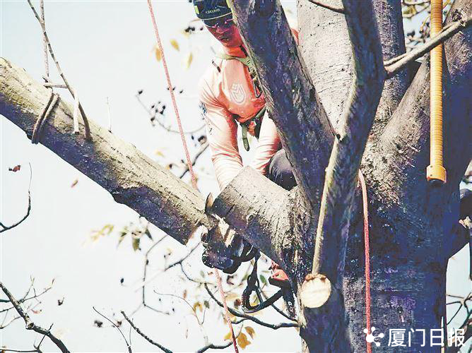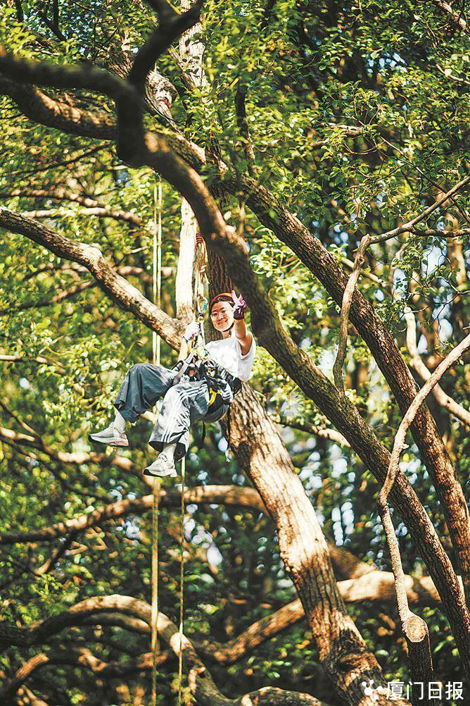 攀树课的开设和攀树队的成立,让攀树运动在厦大校园成为风潮,也让越来越多的人关注“攀树师”这一群体。 从好奇到沉浸 重庆女生为了学攀树而报考厦大 女孩侯鑫在重庆读中学时就听说过厦大攀树课,这件事直接影响了她的高考志愿,她决定考厦大、学攀树。 在厦大,这门新鲜的体育选修课一直是学生心目中的顶流,侯鑫直到大三才抢到“入场券”,成为郑达雄的学生。也是在这门课上,她知道了厦大攀树队。 郑达雄告诉记者,组建攀树队的初衷是带领擅长这项运动的学生打比赛,在专业赛场开眼界、强本领。这也意味着,攀树队代表了厦大攀树运动的最高水平。郑达雄曾多次带领队员们征战亚太攀树锦标赛等专业赛事,频获佳绩。 能够进入攀树队的学生多是攀树课上涌现的好苗子,也有广撒网招进来的“潜力股”。侯鑫是前者,她的队友侯好雪是通过后一种方式进队的。 对没有攀树课基础的学生,入队考察的是体育综合能力,比如400米跑、吊单杠、走扁带、绳结技巧等,分别对应体能、臂力、平衡、学习能力等的评估。“我们那次考核报名的同学挺多,体测都分了好几批。”侯好雪说。 从怎么穿戴护具、怎么打绳结学起,到学会借用绳子带动身体上升,再到身体成功离地、攀上十几米高的大树……随着一项项技能相继解锁,大学生们觉得这件事比自己期待的还要奇妙。“你可以把手机丢在一边,完全沉浸其中。”侯鑫说,向上攀的过程还能闻到很多味道,树皮的、树叶的,也有自由的。 队员李镜舟的“早起困难”也在周三、周六被治愈了,因为这两天早上8时,分别有攀树课和攀树训练在等他。“只要第二天要攀树,我都能早起,甚至不用闹钟。” 从攀树到修树 让攀树成为人与树之间的互动互助 攀树队的训练难度比攀树课高。队员们能在这里学到单绳攀爬、空中走枝、摆荡等技巧,简单地说,就是学成后可以在树上“飞来飞去”。 被队友公认拥有极佳身体控制力的章立心对飞跃要领掌握得很快,但他也会遇到更大的挑战,比如为了修剪树枝,要在高度落差较大的枝条间攀上跃下。 树木修剪,是厦大攀树队的“隐藏技能”。 2016年,超强台风“莫兰蒂”登陆厦门,造成大量树木倒伏。从厦大校园到鼓浪屿再到厦门园林植物园,郑达雄带着厦大攀树队进入吊车开不进的道路,攀上升降机处理不了的高空折损树木,密集开展树木修剪等抢险清障工作,为城市和居民解燃眉之急。会修树的厦大攀树队,进入了大众视野。 厦大攀树队是怎样走上“修树赛道”的?这与攀树师这项职业有关。攀树师是专门从事树木维护、生态保护及相关技术服务的专业人员。国内目前取得国际认证的职业攀树师极少,郑达雄正是其中之一。 但对学生们来说,从攀树到修树,是一个很大的跨越。“它是一棵树,并且十分鲜活。你会担心眼前的枝条该不该剪,或者该从哪个位置下刀。”侯好雪说。 因此当队员进入修树实操阶段,郑达雄首先教给他们的并不是怎么修剪,而是如何保护。“他会教我们一些树木学的知识,告诉我们如何下刀才不会影响树的生长。”侯好雪说。