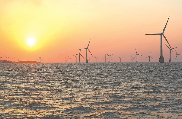 福建福清兴化湾海上风电场,波光粼粼的海面在夕阳的余晖照射下,闪耀着金子般光芒,宛如取之不尽的“金矿”……
