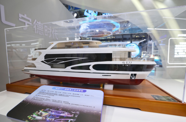 (我国首艘49米双体纯电动推进旅游客船“屿见77”在2025第三届中国海洋装备博览会上亮相。欧东亮 摄)