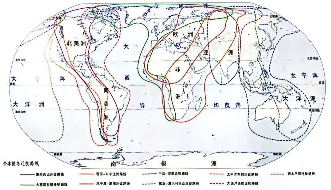 全球候鸟迁徙路线图(来自《中国海洋与湿地鸟类》马志军著)