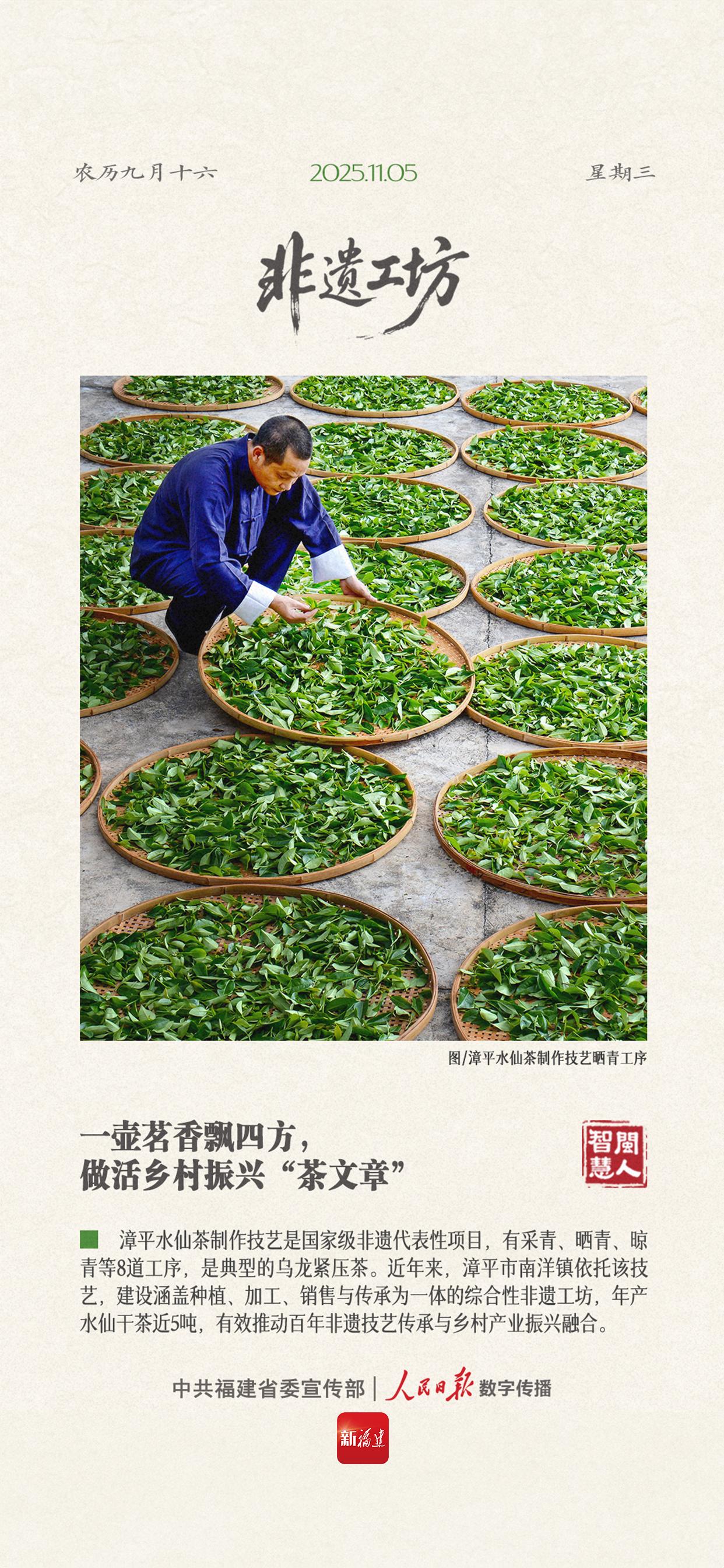 漳平水仙茶制作技艺是国家级非遗代表性项目,有采青、晒青、晾青等8道工序,是典型的乌龙紧压茶。近年来,漳平市南洋镇依托该技艺,建设涵盖种植、加工、销售与传承为一体的综合性非遗工坊,年产水仙干茶近5吨,有效推动百年非遗技艺传承与乡村产业振兴融合。