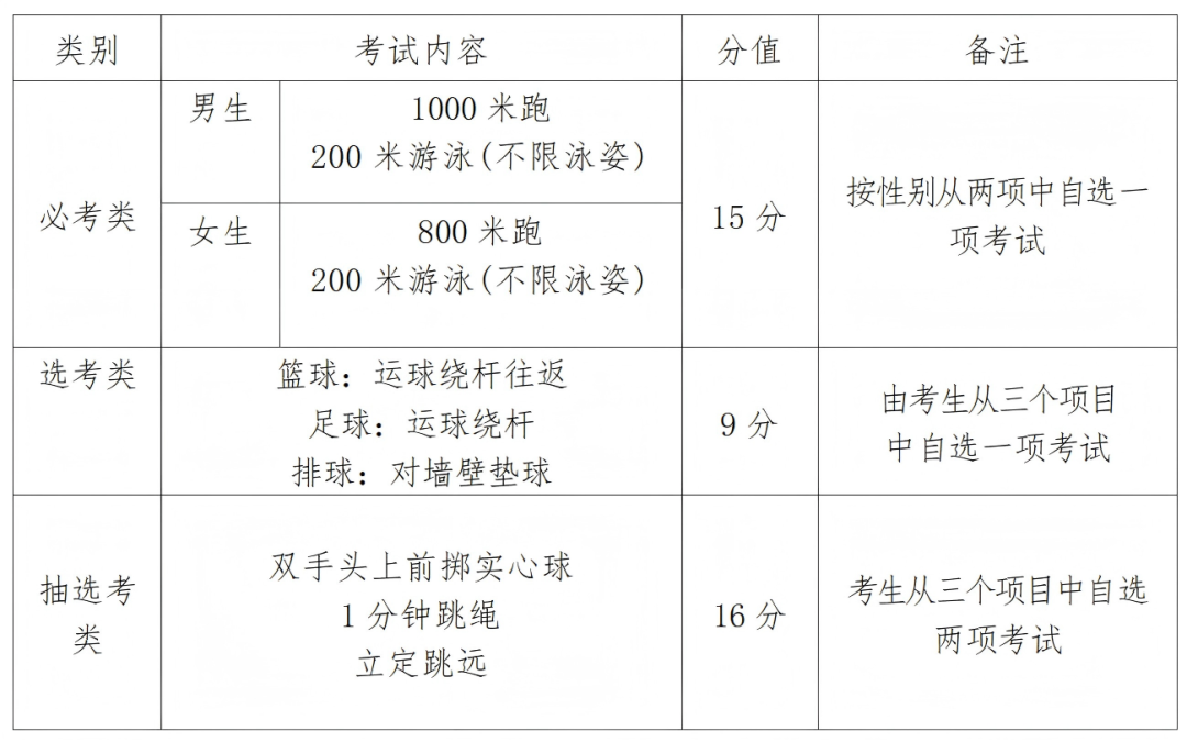 必考类项目为:1000米(男)/800米(女),200米游泳(不限泳姿),考生根据性别自行选择一项考试。