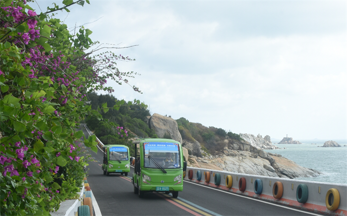 漫步湄洲岛主干道,映入眼帘的是一派绿色出行的场景——往来穿梭的公交与网约车均为新能源车辆,便捷的招手停车辆是电瓶车,游客们则悠闲地骑着共享自行车或电单车欣赏沿路风光。“纯电动公交车行驶平稳、没有尾气、噪音也小,让环岛观光体验更加舒适惬意。”前来旅游的吴先生赞叹道。