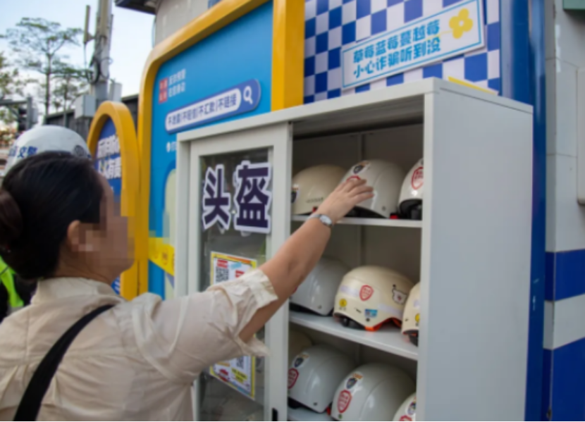 “共享头盔”服务成为泉州整治中的暖心亮点。日前,丰泽街市民张女士因忘戴头盔被交警拦下,执勤交警对其开展安全警示教育后,引导她至路旁“共享头盔”借用点扫码免费领用。“急着出门忘了带,扫码就能用,既不耽误事又保安全。”佩戴好头盔的张女士对此服务赞不绝口。