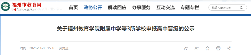 近日,福州市教育局发布3所学校申报高中晋级的公示,福州教育学院附属中学、闽侯县第二中学申报省一级高中,福州市华威高级中学申报省三级高中。