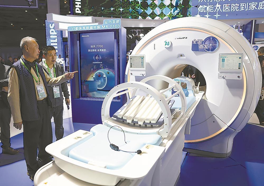 6日,参观者在进博会医疗器械及医药保健展区飞利浦展台了解MR7700多核磁共振设备。这是该产品在中国首发。