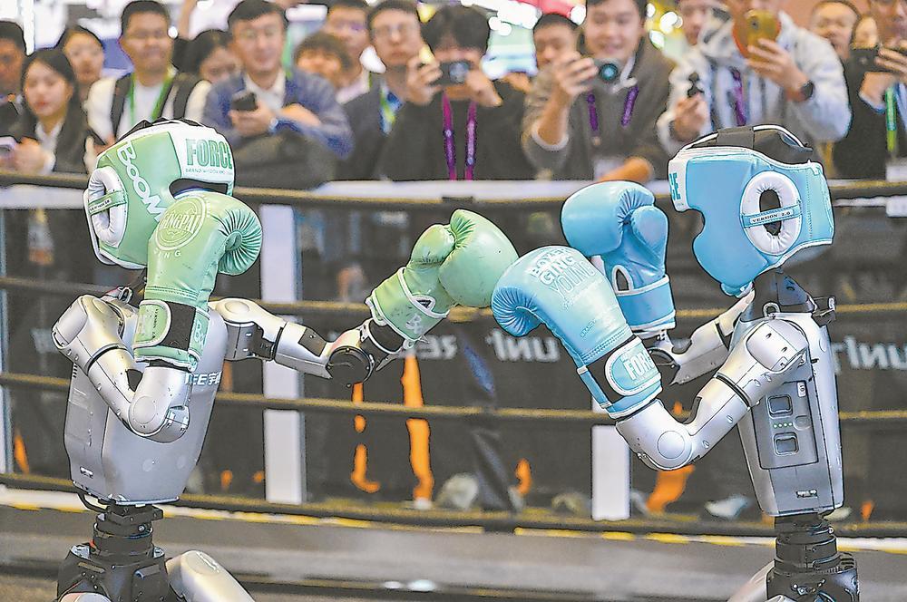 6日,在第八届进博会宇树科技展台,人形机器人进行格斗表演。