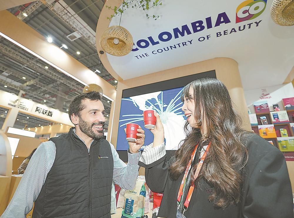 5日,在第八届进博会国家展哥伦比亚馆,参展商(左)和媒体记者一起品尝咖啡。