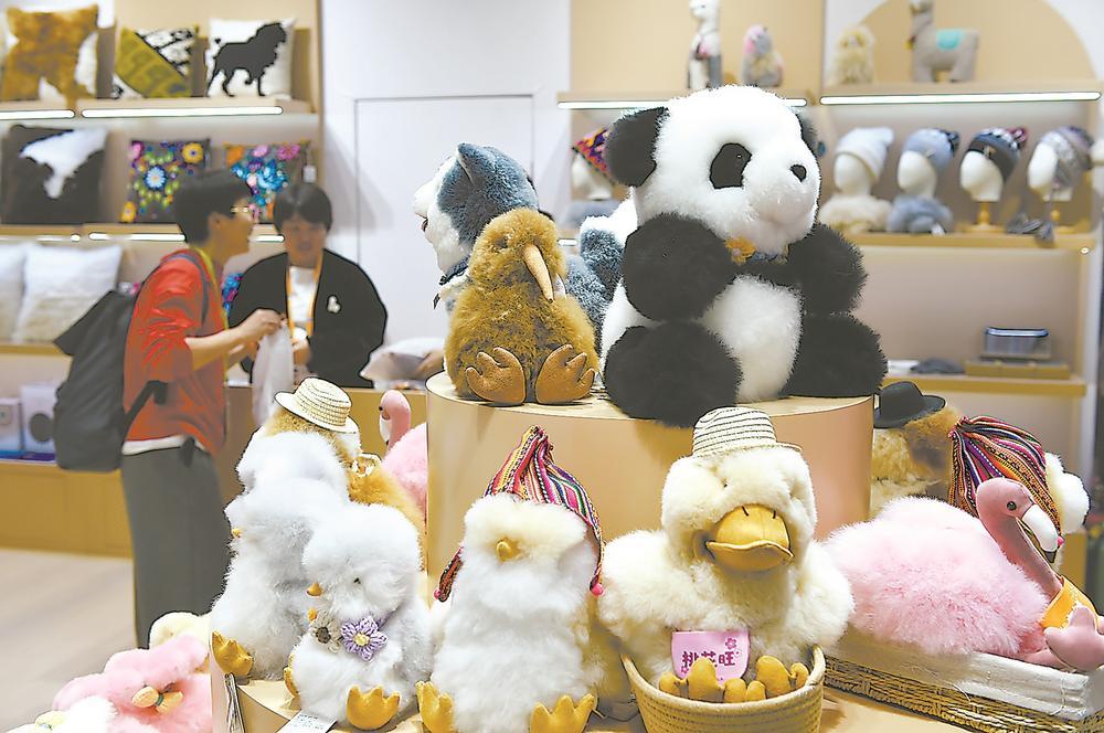 5日,观众在第八届进博会消费品展区选购毛绒玩具。