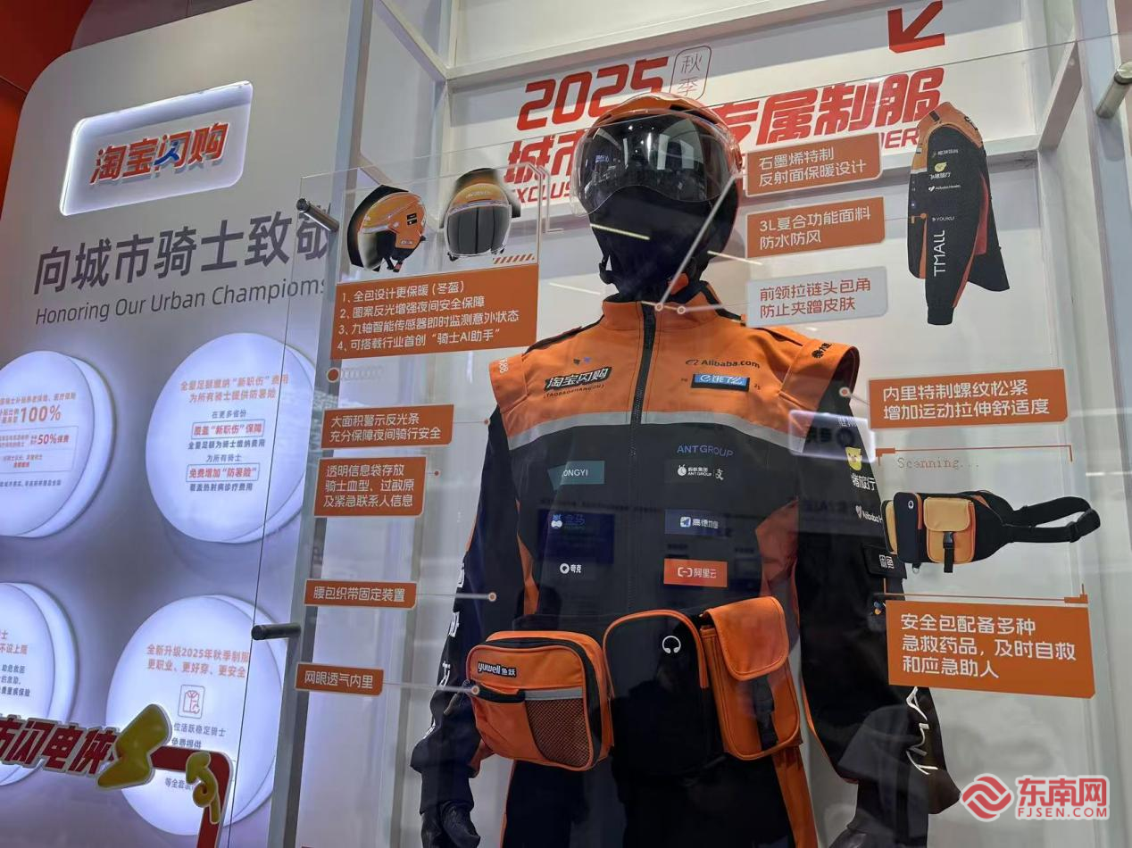 阿里巴巴旗下的淘宝闪购骑士服,采用赛车服设计,更符合骑士们的工作需求。背后采用石墨烯特制反射面保暖设计,让骑士在风雨中也能保证温暖;腰包是由急救包、杂物包和手机包合成;头盔左侧设置功能键和电源键,可以一键接听电话。