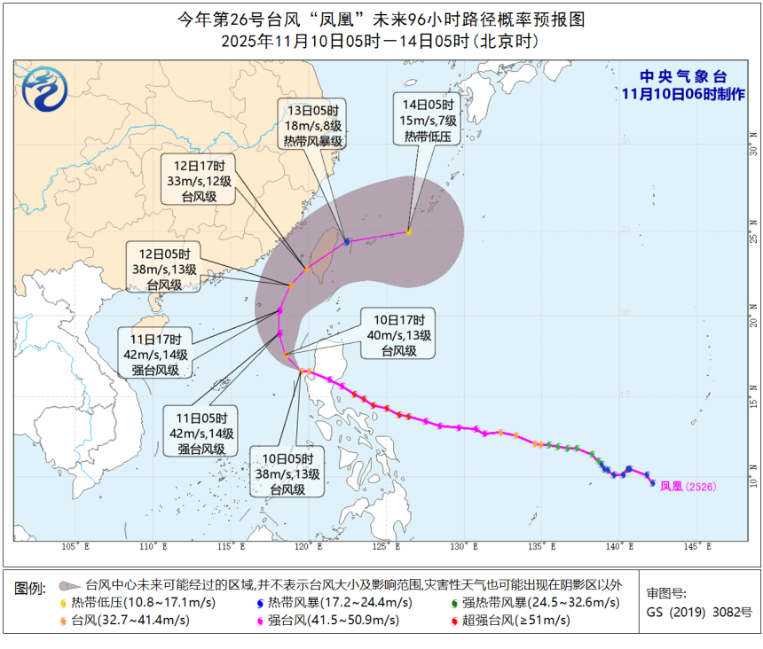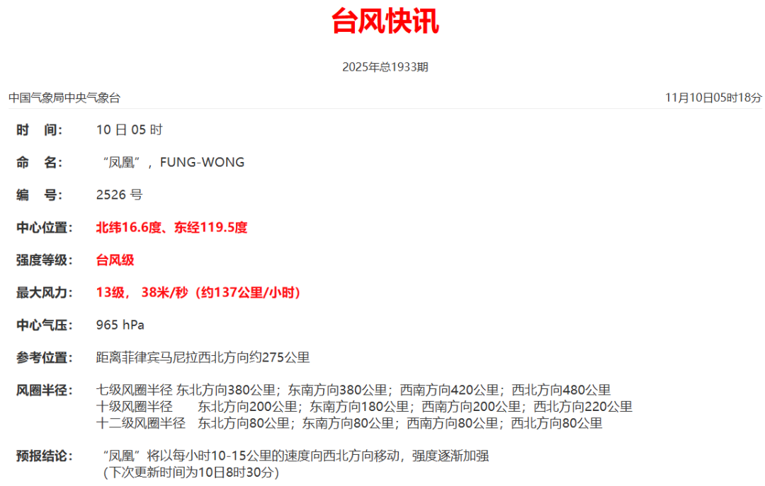 预计,“凤凰”将以每小时10-15公里的速度向西北方向移动,即将于今天中午前后移入南海中东部海面,强度将逐渐增强,预计最大强度可达强台风级(14级,42-45米/秒),11日夜间开始逐渐转向东北方向移动,强度逐渐减弱,并将于12日下午到晚上在台湾岛西南部沿海再次登陆(强热带风暴级或台风级,10-12级,28-33米/秒),以后迅速减弱。