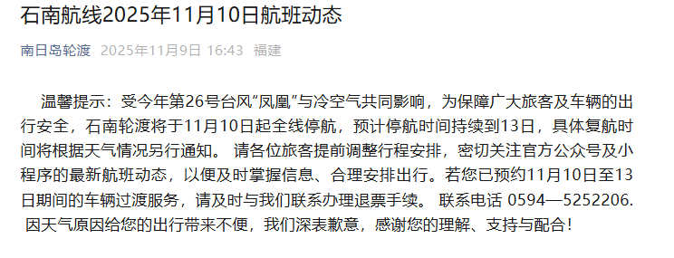 受气候因素影响,厦金、泉金航线11月10日(周一)停航,复航时间另行通知。请旅客关注气象信息,提前做好行程安排。