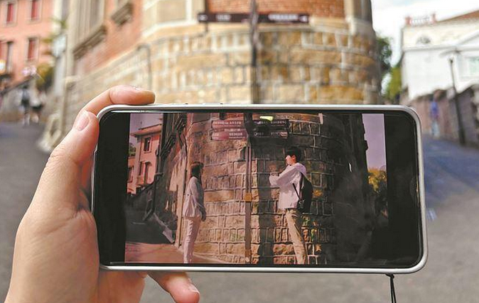 厦门鼓浪屿“最美转角”是《暗恋·橘生淮南》中的浪漫地标,游客将手机屏幕中的剧照和现场原址对比拍照留念。厦门日报记者 柯笛摄