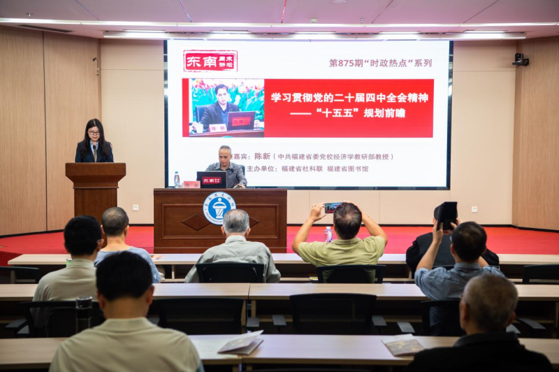 东南网11月11日讯(本网记者 郑琦 文)党的二十届四中全会对“十五五”时期经济社会发展作出了顶层设计和战略擘画,鼓舞人心,催人奋进。11月8日上午,由福建省社科联、福建省图书馆共同主办的“东南周末讲坛”开展学习贯彻党的二十届四中全会精神首场讲座。中共福建省委党校经济学教研部教授陈新以“学习贯彻党的二十届四中全会精神——‘十五五’规划前瞻”为题,深入阐释了全会精神的精髓要义,并以前瞻性视野,对“十五五”时期我国经济社会发展的主要目标、战略部署、实现路径等内容进行了细致解读,帮助广大读者深刻理解国家发展方略,进而凝聚奋进新征程的共识与力量。