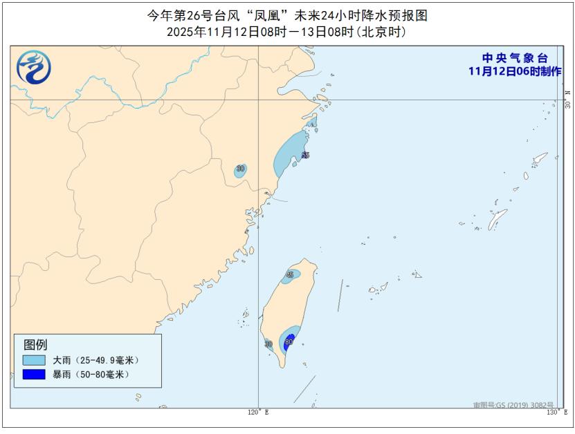 降水预报:12日8时到13日8时,浙江东部、台湾岛北部和南部将有大到暴雨(50—80毫米)。