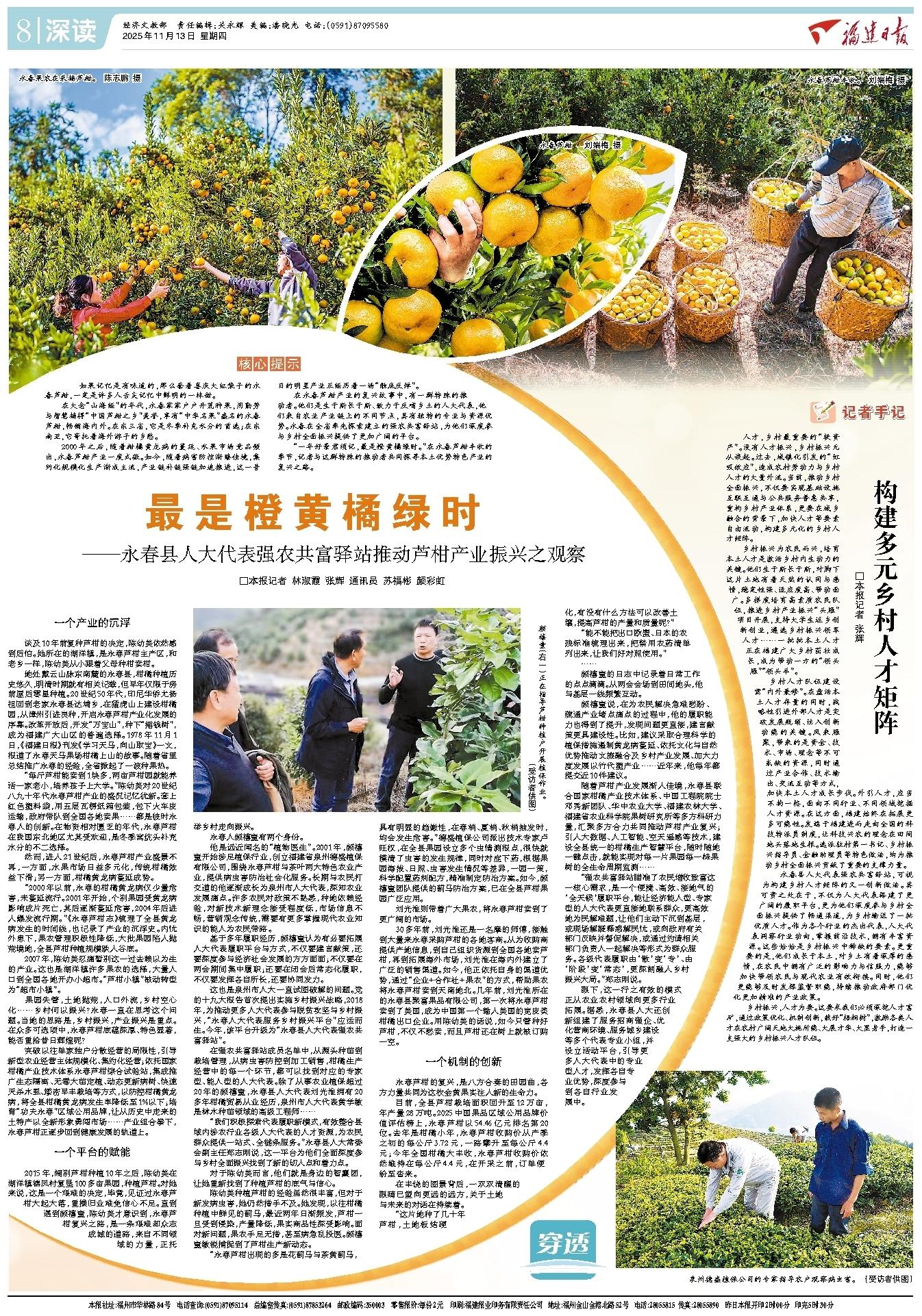 在永春芦柑产业的复兴故事中,有一群特殊的推动者。他们是生于斯长于斯、致力于反哺乡土的人大代表,他们来自农业产业链上的不同节点,具有独特的专业与资源优势。永春在全省率先探索建立的强农共富驿站,为他们深度参与乡村全面振兴提供了更加广阔的平台。