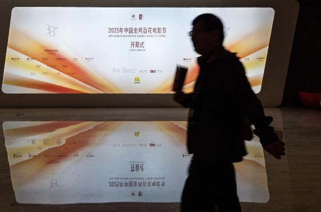 11月11日,2025中国金鸡百花电影节在福建省厦门市开幕。一名男子在闽南大戏院的电影节海报栏前经过。新华网记者 钟奕摄