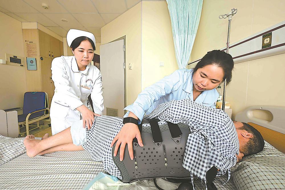 福州市第二总医院骨科护理员给患者翻身。(资料图片)