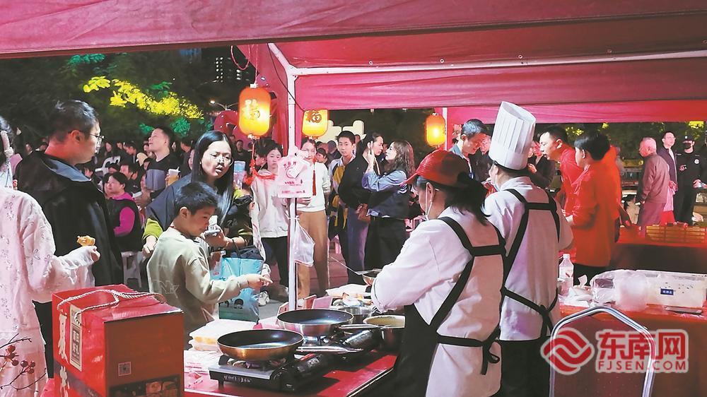 表演还未开始,舞台两旁的摊位早已是一派热火朝天的景象。“红团红团,好吃的红团。”莆田红团摊主周志健一边吆喝一边掀开蒸笼盖子,热气瞬间弥散开来,一颗颗鲜红诱人的红团展现在众人面前。“我们下午就早早过来出摊,现在已经卖了100多份。”周志健喜笑颜开。