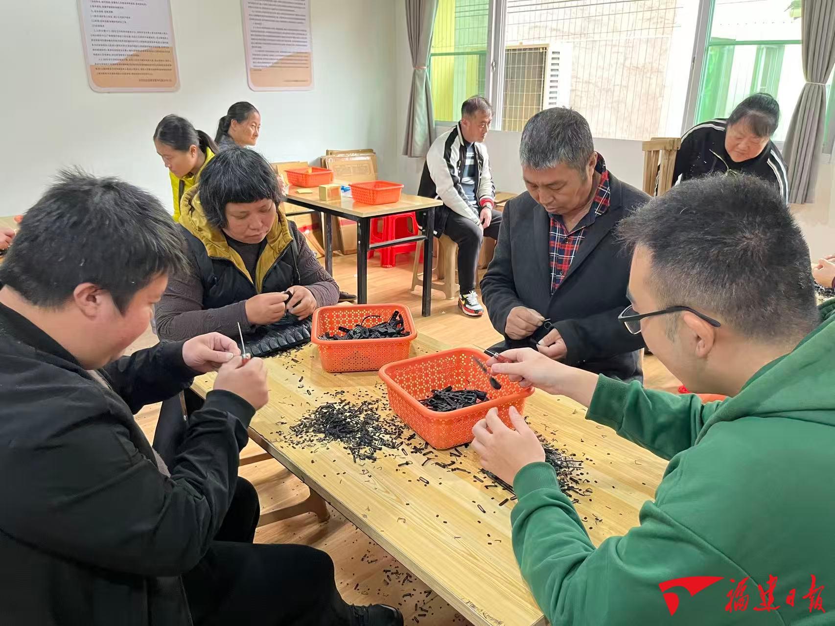 古田县城西街道青云社区“爱心助残驿站”里,残疾人正在做手工活。