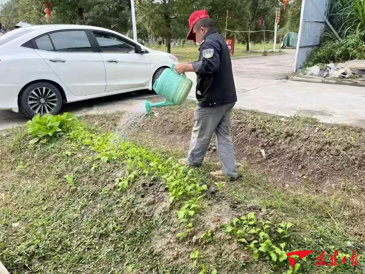 残疾人阿杰在“爱心助残驿站”的菜园里浇水。