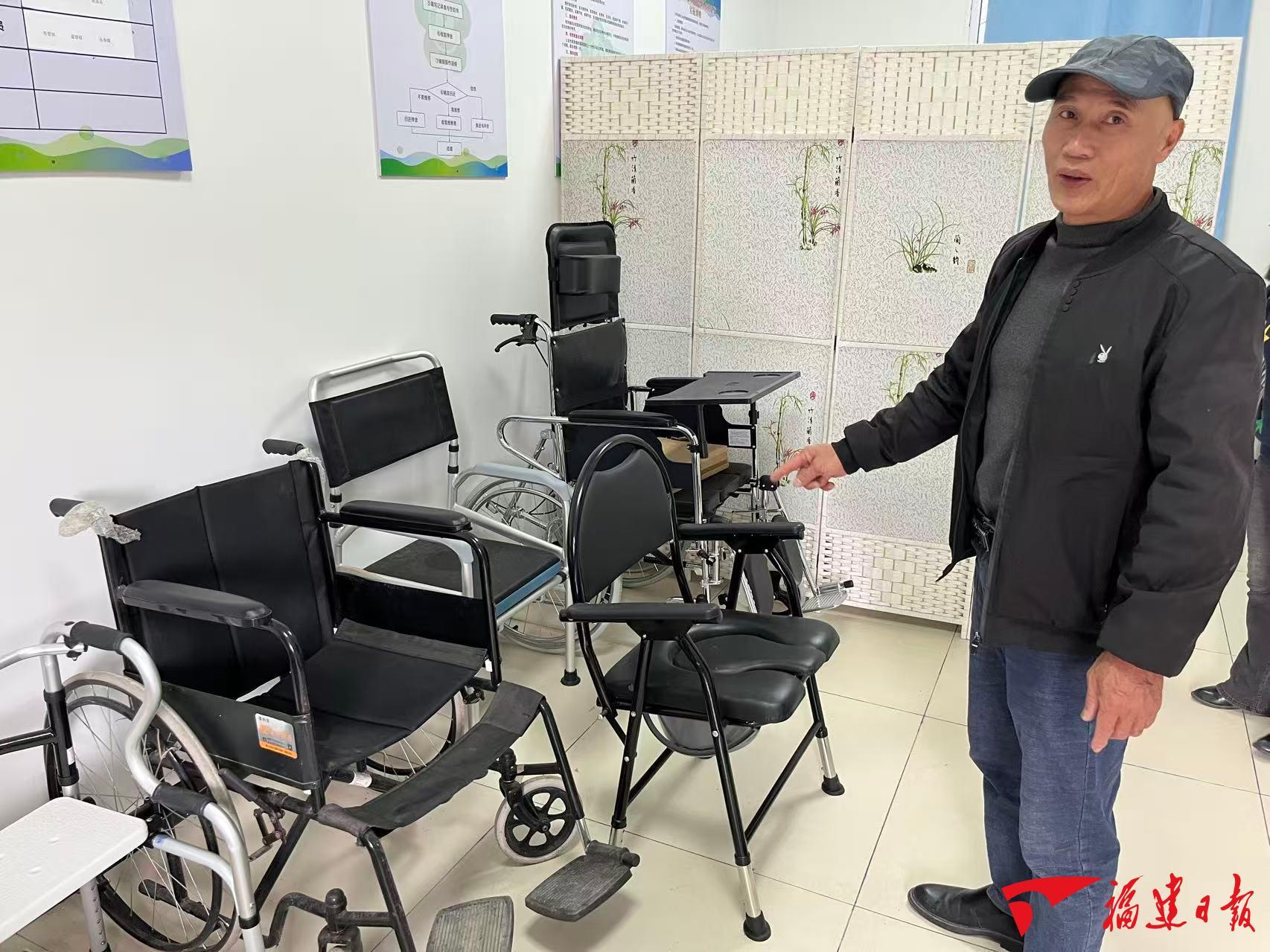 古田县凤埔乡苏墩村“爱心助残驿站”负责人介绍为残疾人提供的多种辅具。