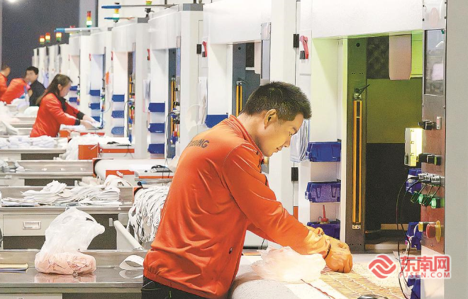 安踏自动化裁切车间里,工人操作自动化裁断机制作鞋面。福建日报记者 王毅 摄