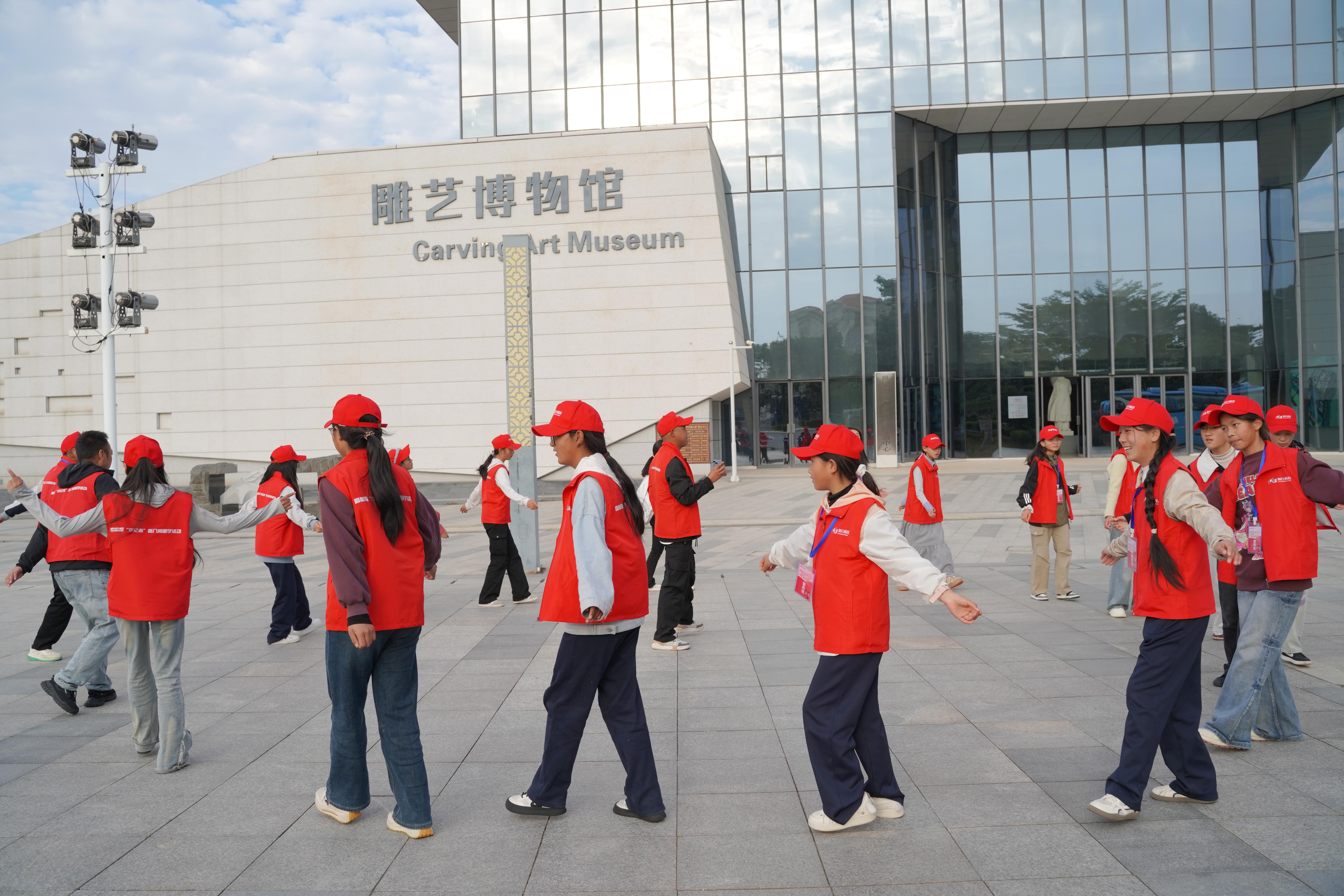 在上午的行程中,师生们还通过宣传片初步领略了惠安雕刻艺术的精湛技艺与惠安女“勤劳勇敢、贤惠善良”的精神内涵。带着这份初步印象,下午大家走进雕艺博物馆,开启了一场从理论到实践的深度体验。惠安女服饰的特色与内涵在实物展品中变得具体可感;在《子非鱼,呼吸》作品前,大家沉思环境保护的重要意义;在《荣升》作品中,他们读懂了“胜不骄、败不馁”的人生品格。艺术的感染力超越了语言的障碍,走出博物馆时,深受艺术感染的师生们在广场上跳起欢快的藏族舞蹈,用最美的肢体语言回应这场文化的洗礼。