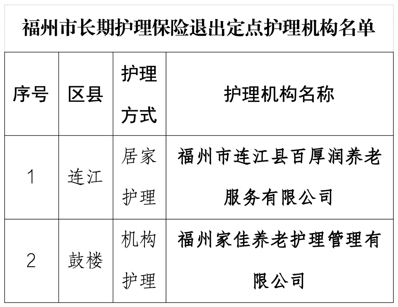 此外,取消福州市连江县百厚润养老服务有限公司、福州家佳养老护理管理有限公司长期护理保险定点护理机构资格。