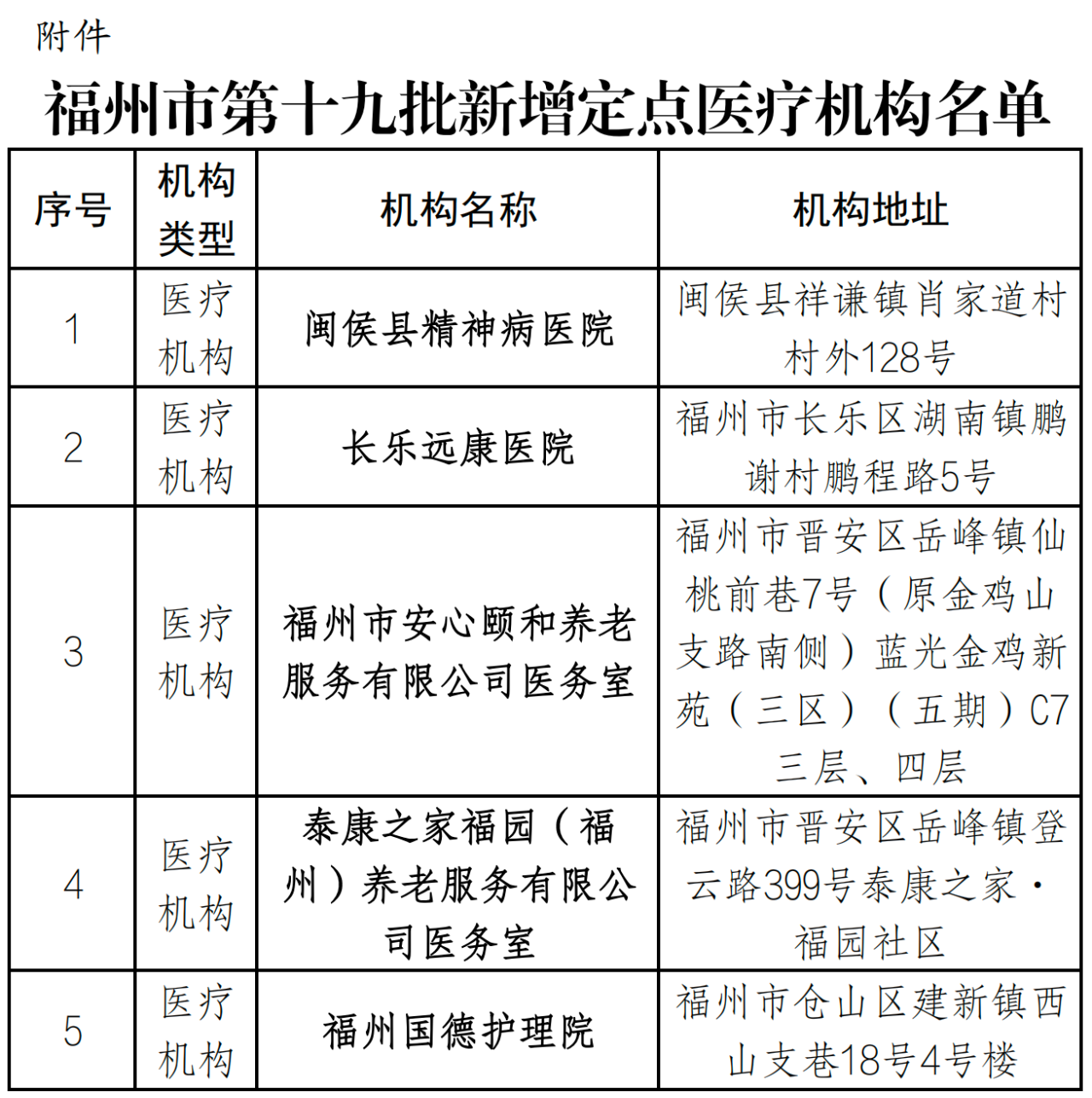 新增5家福州市医保定点单位为:闽侯县精神病医院、长乐远康医院、福州市安心颐和养老服务有限公司医务室、泰康之家福园(福州)养老服务有限公司医务室、福州国德护理院。