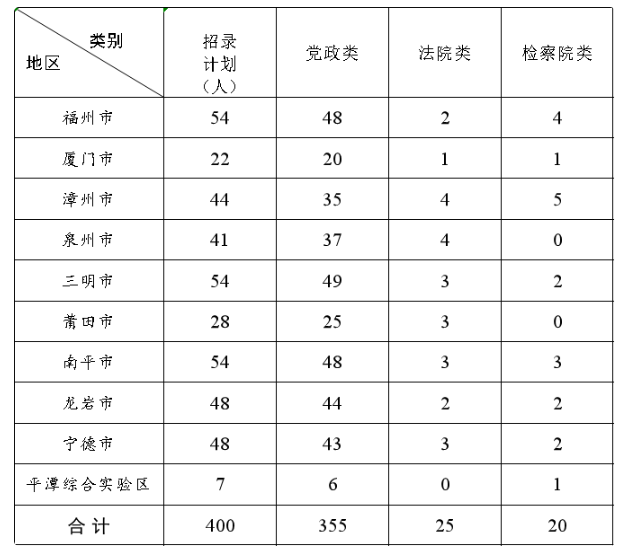 (一)计划从福建省内外〔不含国(境)外,下同〕部分高校福建生源2026年全日制应届硕士、本科优秀毕业生中,选拔选调生400名,其中:党政类355名、法院类25名、检察院类20名。
