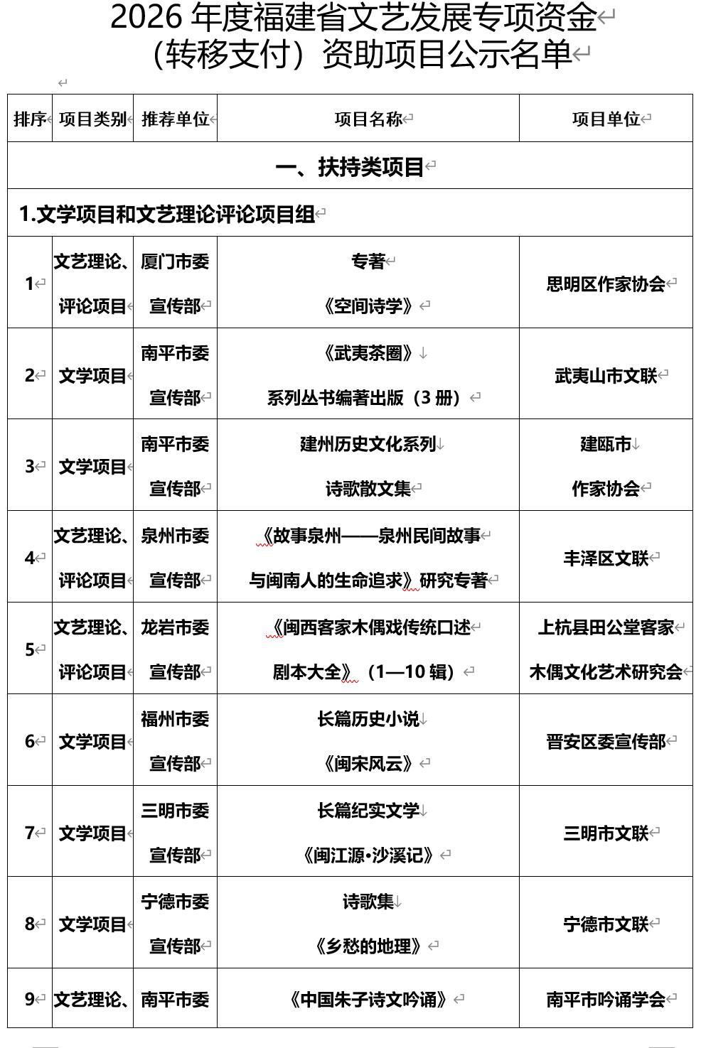根据我省专项资金管理办法,现将2026年度福建省文艺发展专项资金(转移支付)拟资助和奖励的项目予以公示。公示时间从2025年11月24日开始,公示期为五个工作日。