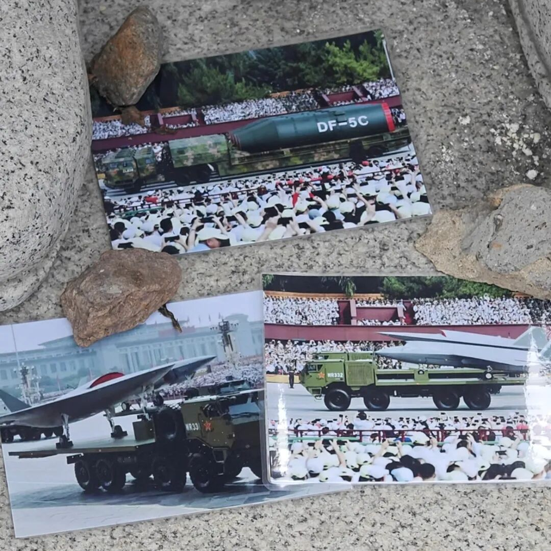 吴石将军雕像前,摆放着三张我国新型武器装备的照片。图源:海峡都市报