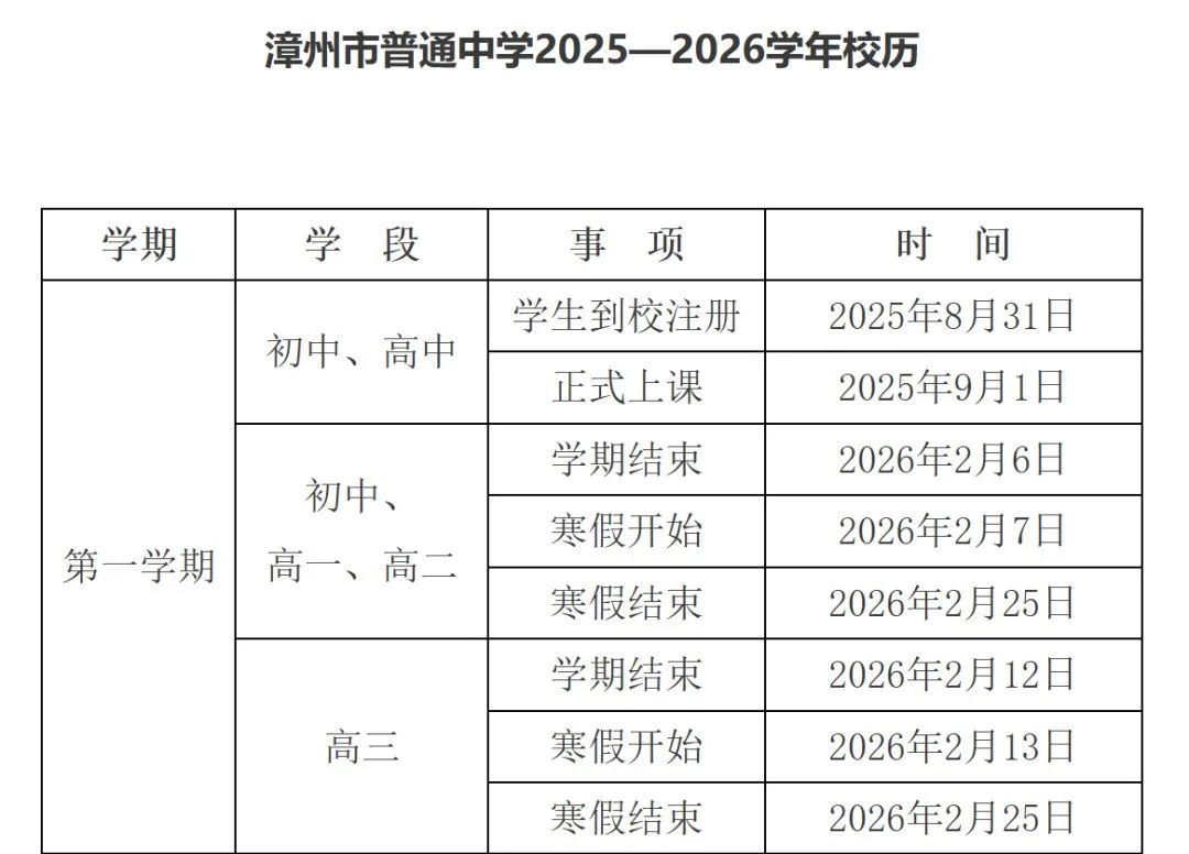 第一学期:2025年9月1日(星期一)正式开学,2026年2月6日(星期五)学期结束。2026年2月7日(星期六)至 2026年2月25日(星期三)寒假。