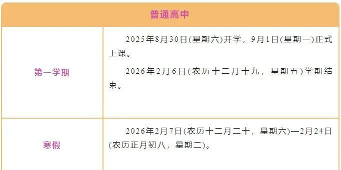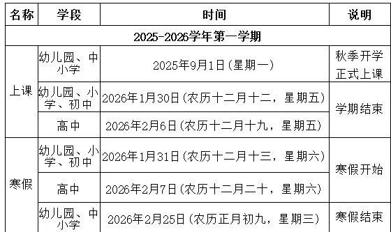 第一学期:2025年9月1日(农历七月初十,星期一)秋季开学,正式上课,2026年2月6日(农历腊月十九,星期五)学期结束。本学期教学时间(包括集体教育活动和复习考试时间)为22周。2026年2月7日(农历腊月二十,星期六)至2月25日(农历正月初九,星期三)寒假。