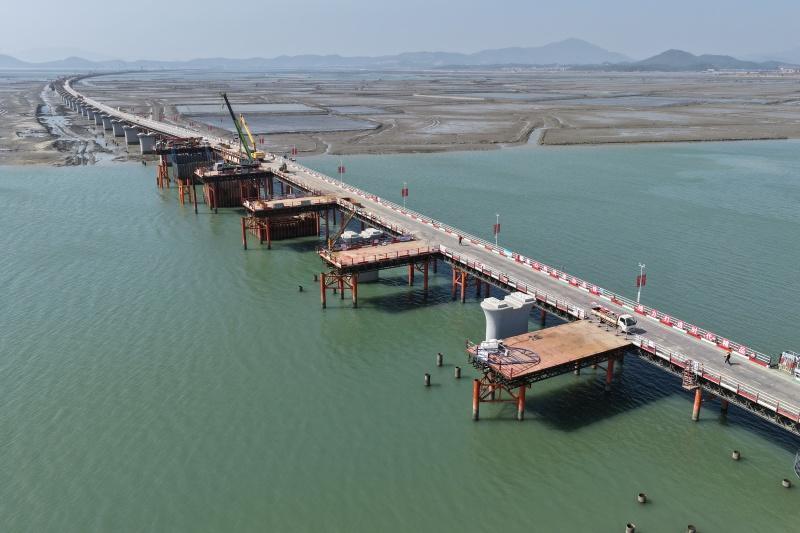 漳汕高铁东山跨海特大桥建设现场。(陆逸 摄)