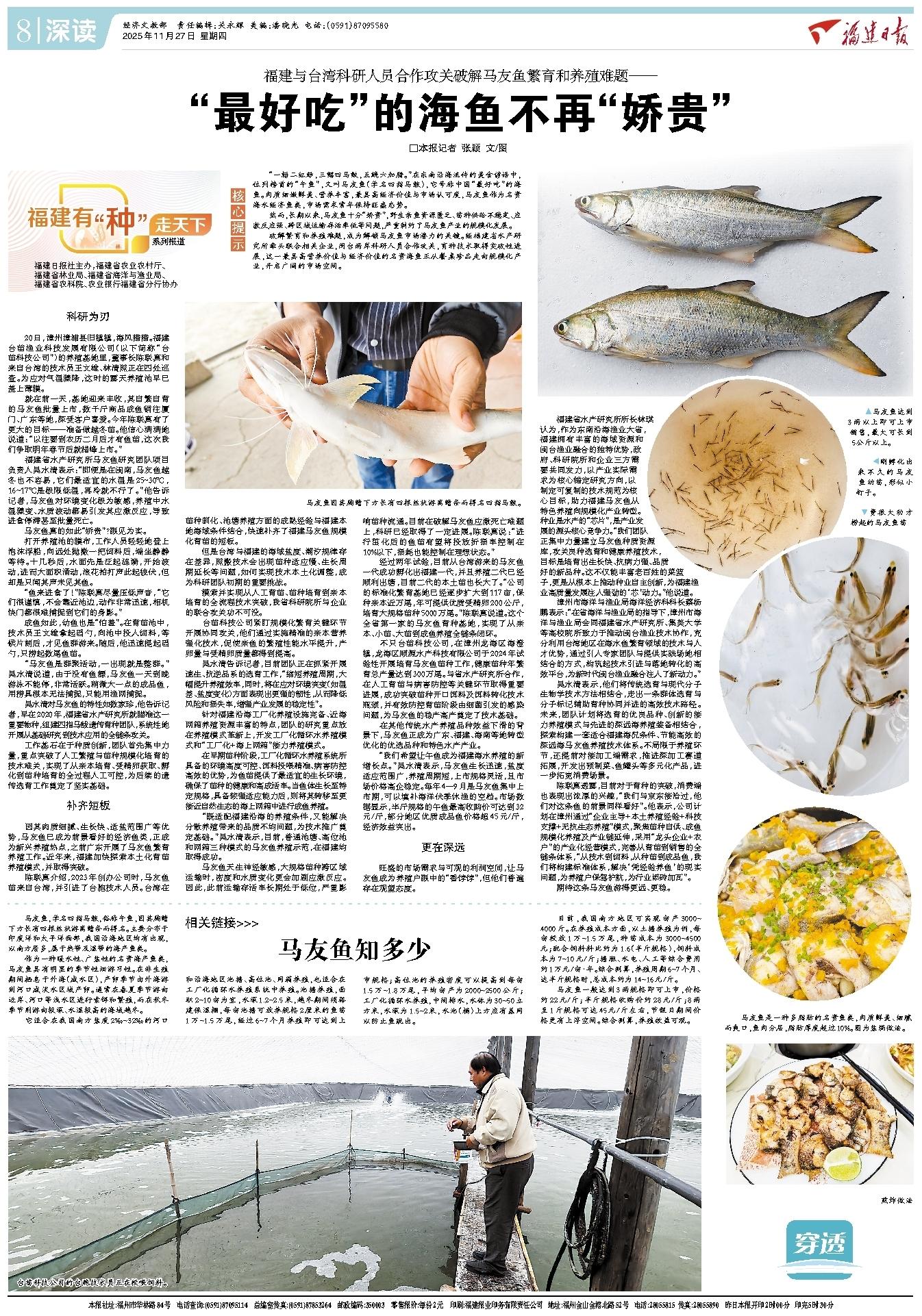 吴水清表示,他们将传统选育与现代分子生物学技术方法相结合,走出一条群体选育与分子标记辅助育种协同并进的高效技术路径。未来,团队计划将选育的优良品种、创新的接力养殖模式与先进的深远海养殖装备相结合,探索构建一套适合福建海况条件、节能高效的深远海马友鱼养殖技术体系。不局限于养殖环节,还提前对接加工端需求,推进深加工赛道拓展,开发出预制菜、鱼罐头等多元化产品,进一步拓宽消费场景。