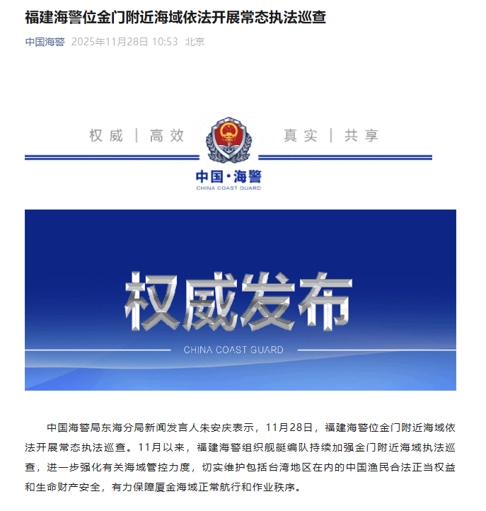 中国海警局东海分局新闻发言人朱安庆表示,11月28日,福建海警位金门附近海域依法开展常态执法巡查。11月以来,福建海警组织舰艇编队持续加强金门附近海域执法巡查,进一步强化有关海域管控力度,切实维护包括台湾地区在内的中国渔民合法正当权益和生命财产安全,有力保障厦金海域正常航行和作业秩序。