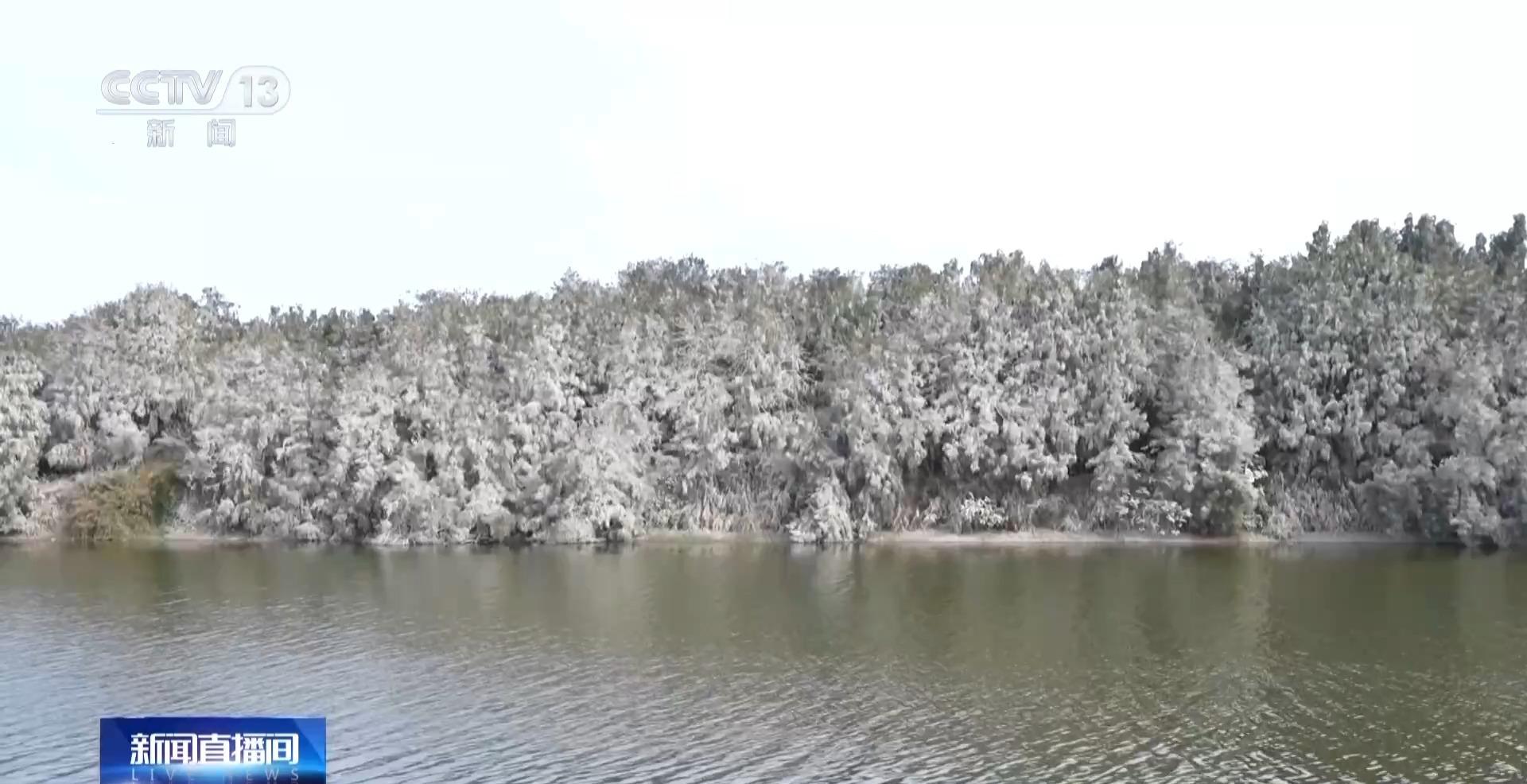 来到福州市长乐区的东湖湿地,400多米的木麻黄林沿着湖边绵延。这片树林“银装素裹”,仿佛披上了一件素雅的冬装。成群的鸬鹚在这里栖息,有的在水面上低飞觅食,有的停留在树梢休憩。疑似“雾凇”的景观吸引了不少观鸟爱好者到来。