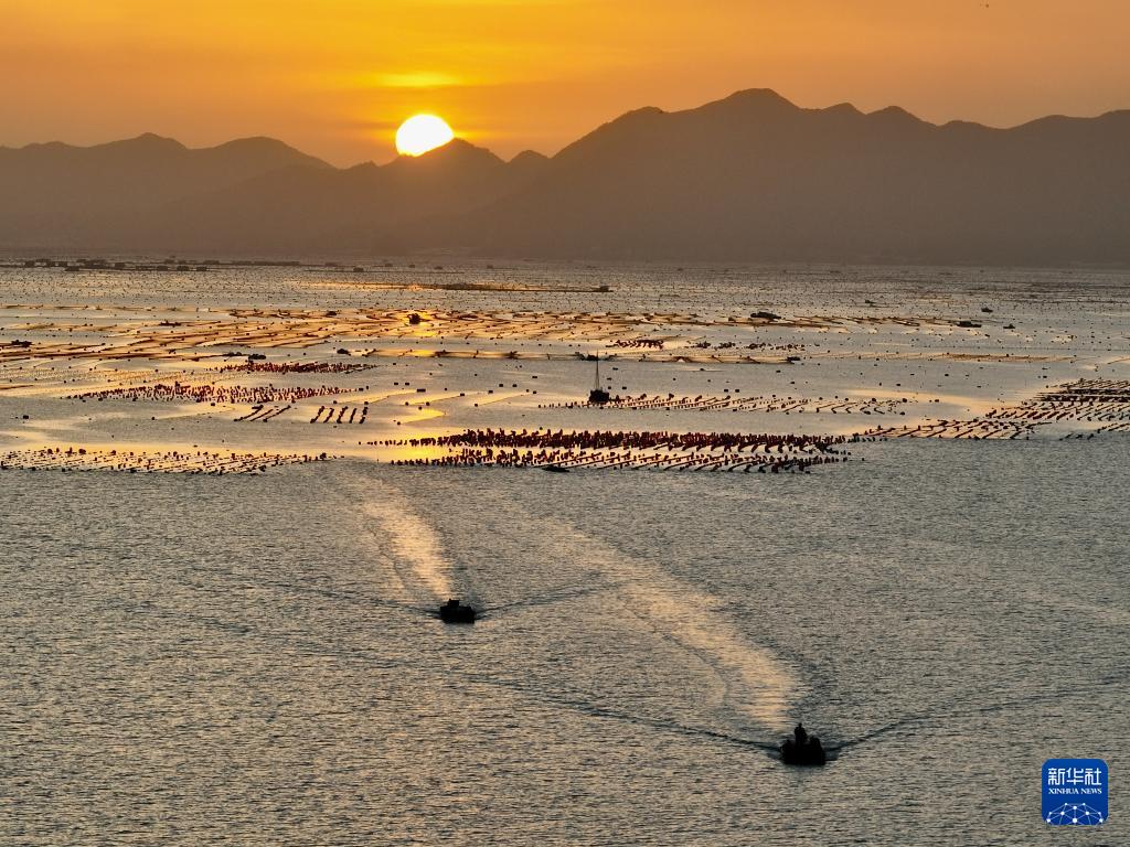 11月28日,福建省宁德市霞浦县海上养殖区两艘渔船在日落时分返港(无人机照片)。