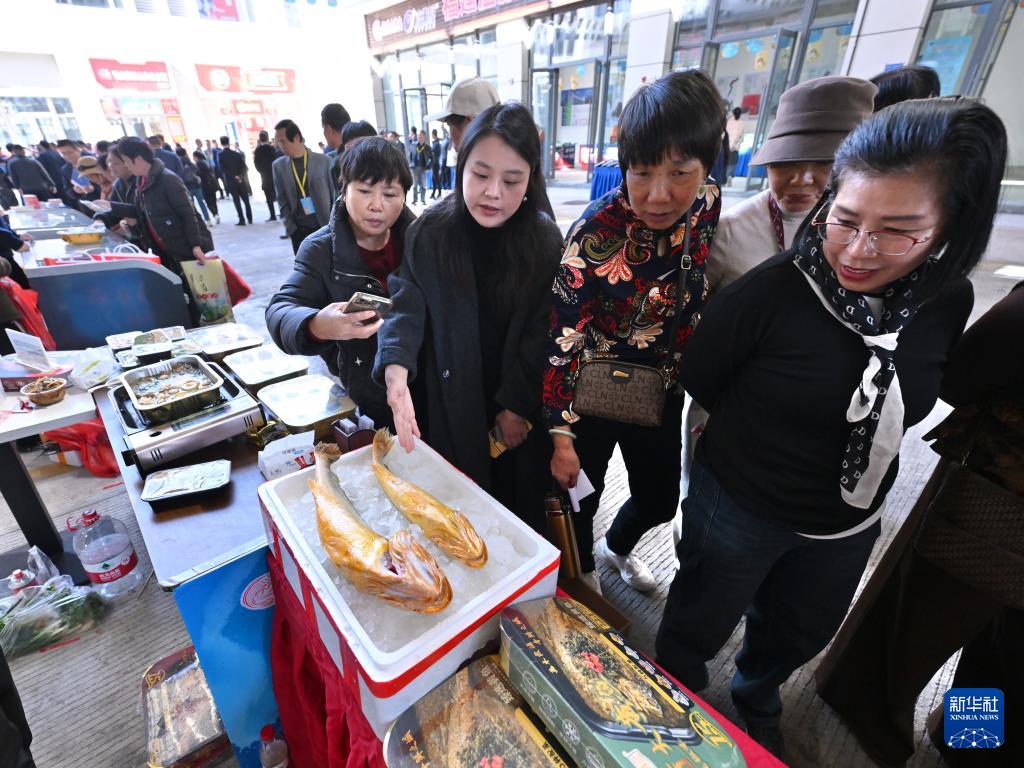11月29日,游客在第九届宁德(霞浦)大黄鱼产业创新发展大会线下展销促销活动上选购大黄鱼产品。