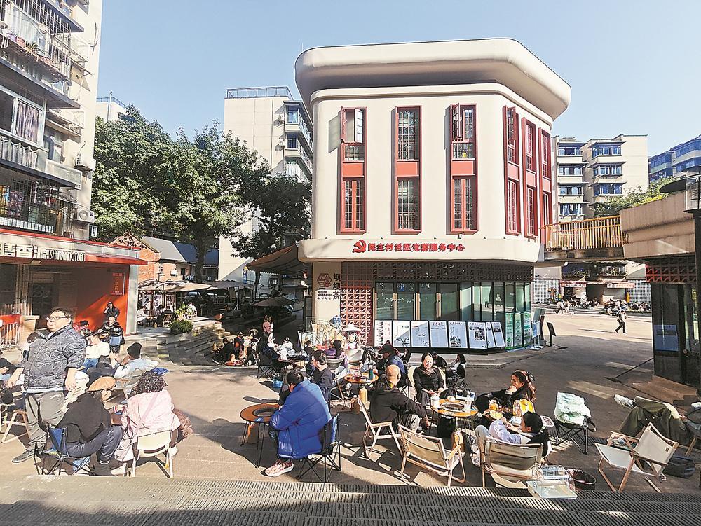 27日下午2点半,在寸土寸金的重庆九龙新商圈,一幅犹如绿洲的奇景呈现眼前。在高大写字楼和大型商业综合体的包围中,民主村社区党群服务中心前后、建设渠旁、社区食堂前的空坪上、3楼天台、黄葛树下,到处是茶桌、咖啡桌、露营桌,老人、青年甚至猫狗都慵懒地享受着冬日暖阳。