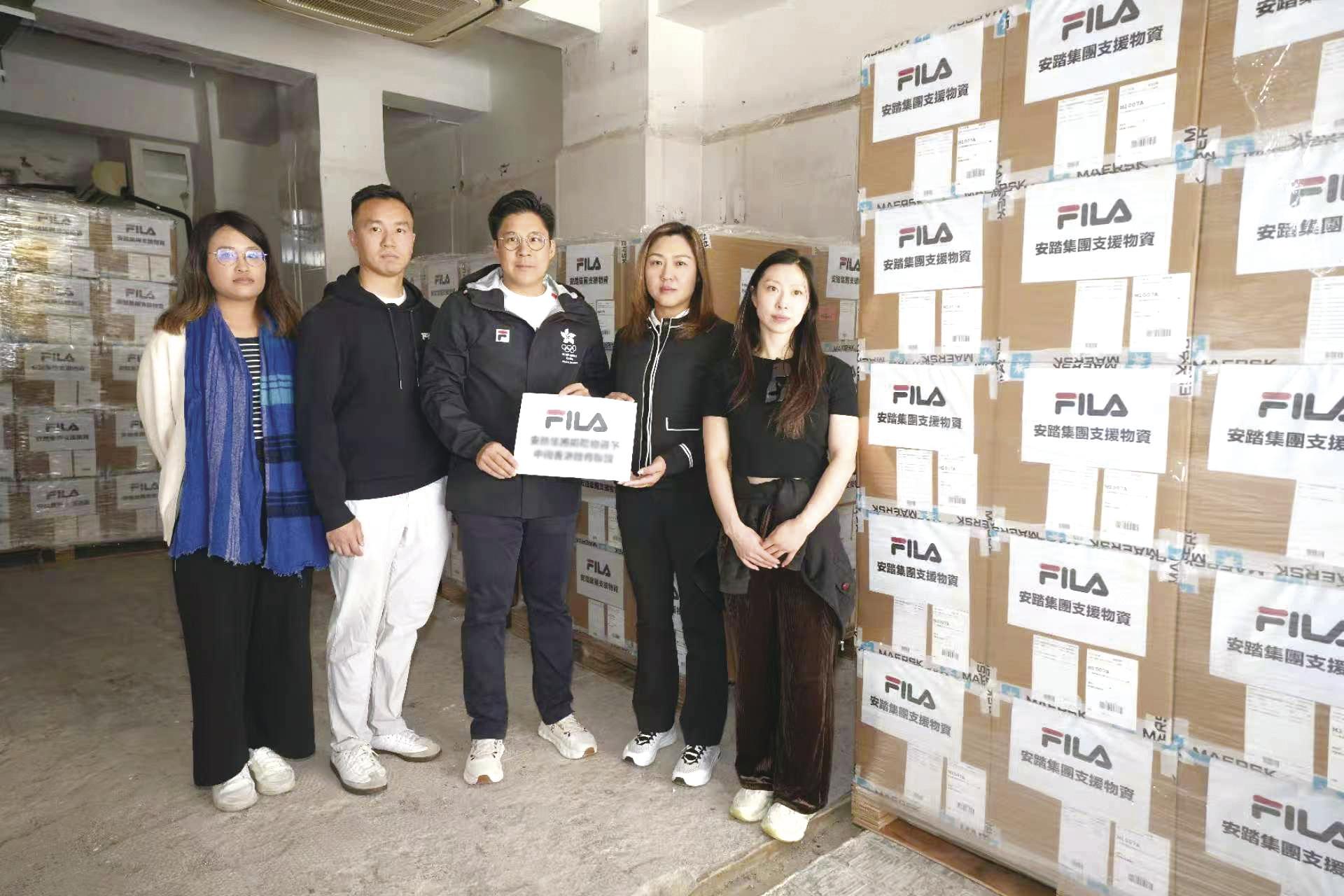 全国人大代表、中国香港体育协会暨奥委会副会长霍启刚(中)作为代表,接收安踏捐赠的支援物资。