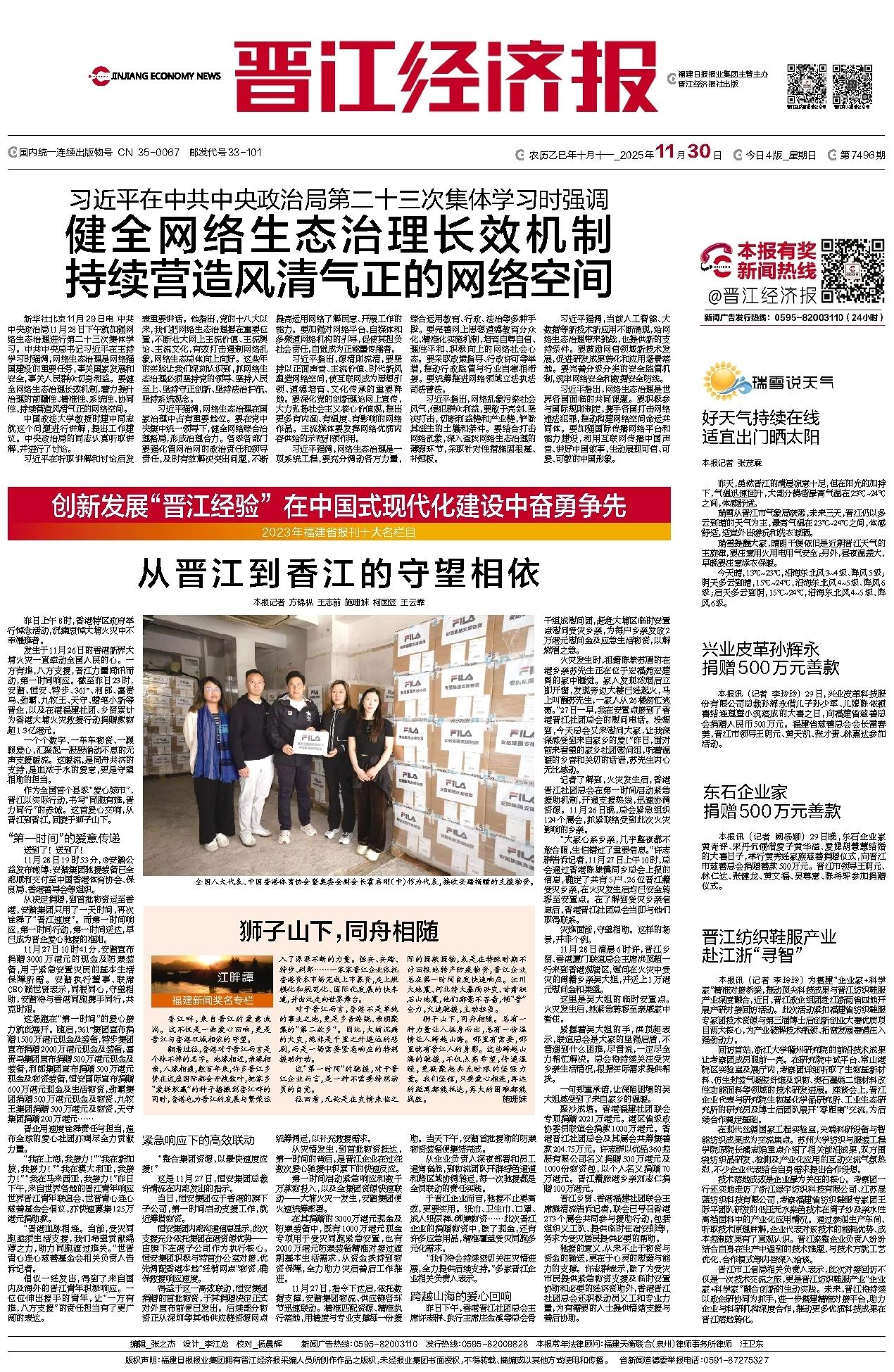发生于11月26日的香港新界大埔火灾一直牵动全国人民的心。一方有难,八方支援,晋江力量闻讯而动,第一时间响应。截至昨日23时,安踏、恒安、特步、361°、利郎、富贵鸟、劲霸、九牧王、天守、蜡笔小新等晋企,以及在港福建社团、乡贤累计为香港大埔火灾救援行动捐赠款物超1.3亿港元。