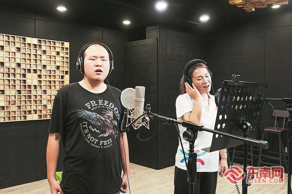 大陆视障青年郑达鸿(左)与台湾青年歌手沈怡君在录音棚里录制母带。